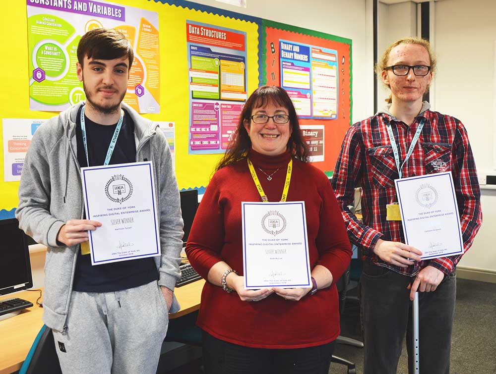First year Hugh Baird College A-level students, Cameron Ferguson and Harry Tyrrell have both achieved their bronze and silver iDEA awards alongside A-level Computer Science tutor, Beth McCue.